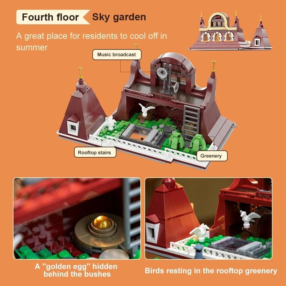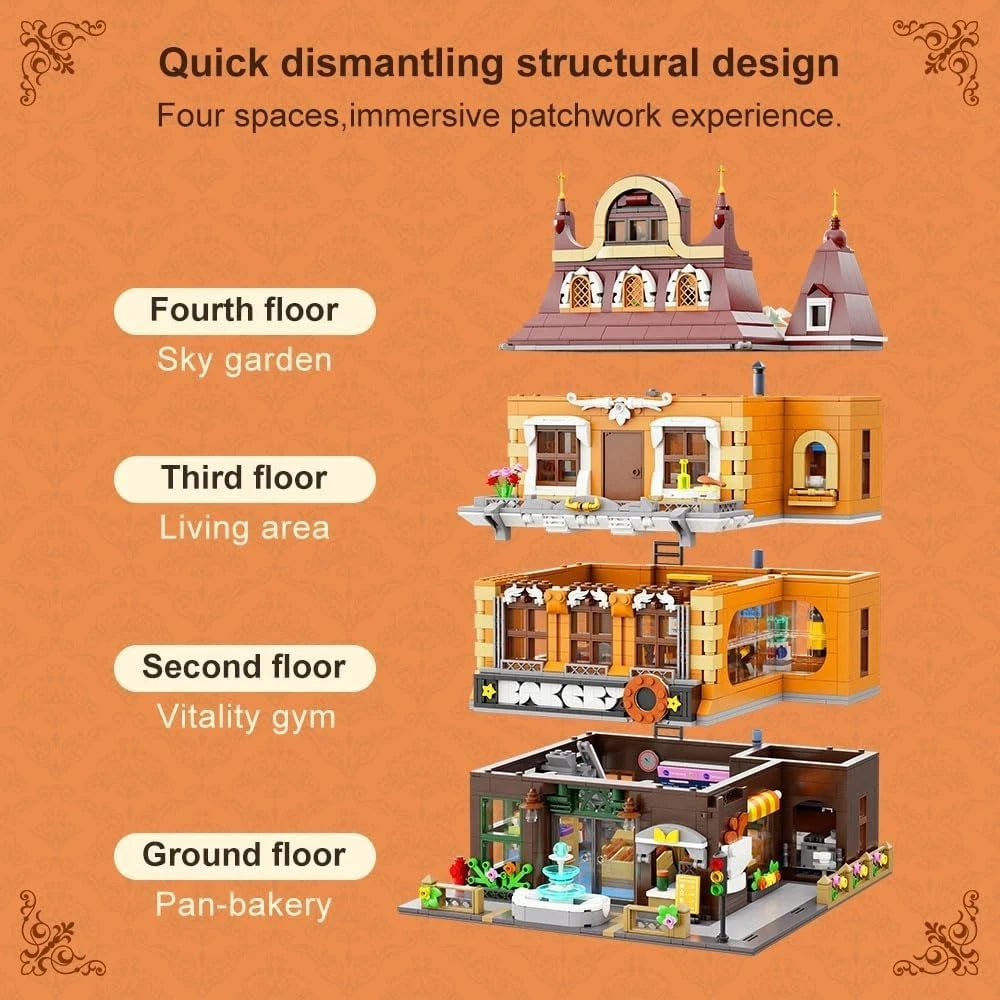 Die Pantasy Europäische Bäckerei ist ein detailreiches Baustein-Set und Modular Building im klassischen Pariser Straßenstil. Das vierstöckige Gebäude vereint eine lebendige Bäckerei mit charakteristischem Olivenölbrot, ein modernes 24-Stunden-Fitnessstudio, stilvolle Wohnräume und einen ruhigen Dachgarten mit Brunnen. Jede Etage ist liebevoll gestaltet und bietet abwechslungsreiche Szenen vom Backen über Training bis zur Entspannung. Hochwertig verarbeitete Steine von Qualitätshersteller GoBricks machen dieses Set zu einem besonderen Highlight für Sammler, Architektur- und Klemmbaustein-Fans.