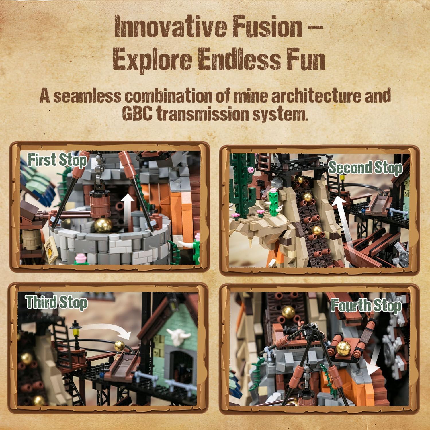 Die Pantasy Western Goldmine ist ein detailreiches Baustein-Set für Fans historischer Szenen und technischer Mechanik. Die aufwendig gestaltete Bergwerkslandschaft mit Mineneingang, Kran und Arbeiterhütten bildet die Atmosphäre des amerikanischen Goldrauschs authentisch nach. Ein motorisiertes GBC-Kugelbahnsystem transportiert goldene Kugeln durch das gesamte Bergwerk und sorgt für ein faszinierendes, kinetisches Spielerlebnis. Hochwertige Bausteine, eine einfache elektronische Steuerung und exklusive Minifiguren machen dieses Set zu einem besonderen Highlight für Sammler, Technik- und Klemmbaustein-Enthusiasten. Über USB Typ C lässt sich der Motor für die Motorisierung antreiben.