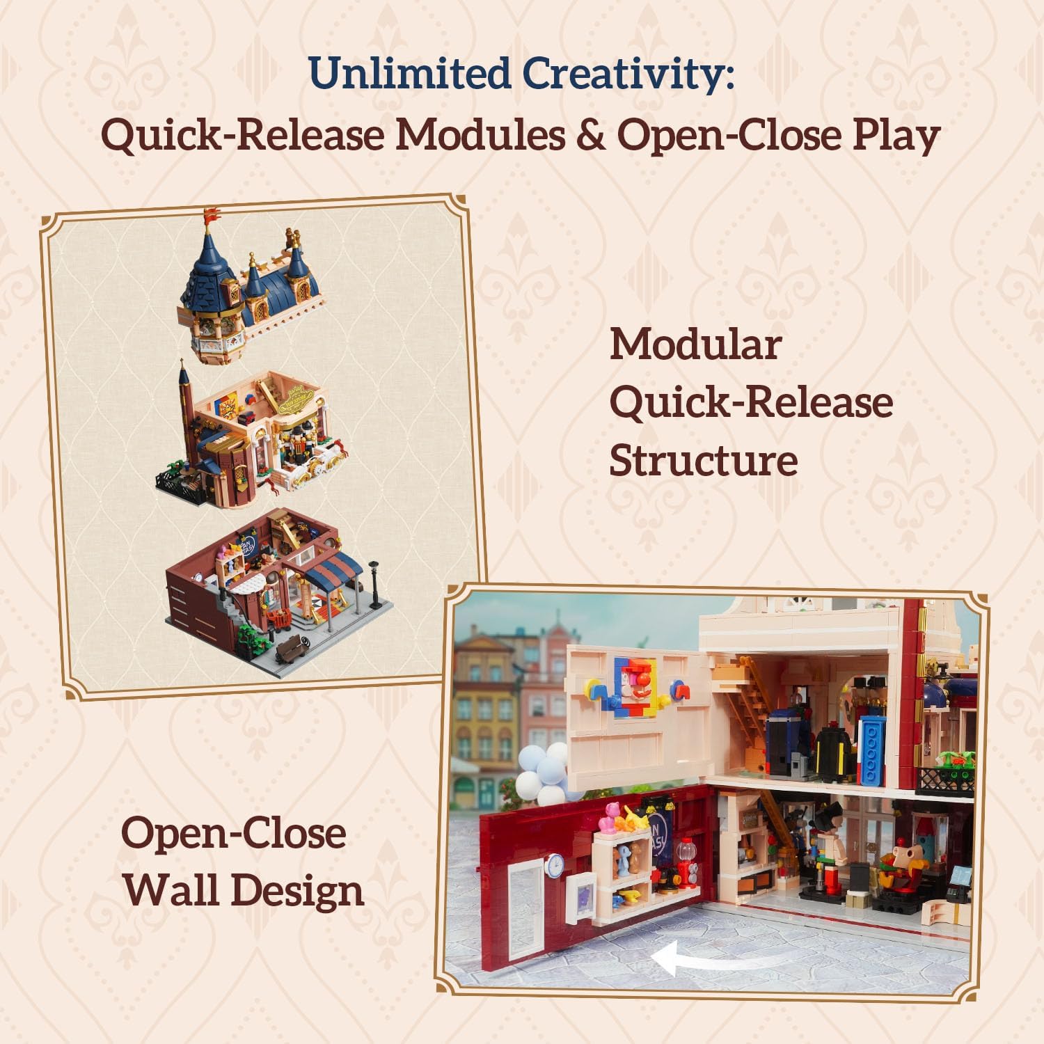Der Pantasy Spielzeugladen im Schlossdesign ist ein detailreiches Baustein-Set und Modular Building im Stil eines europäischen Märchenschlosses. Das dreistöckige Gebäude mit Türmen, Rundbogenfenstern und verspielten Details begeistert mit liebevoll gestalteten Innenräumen, Miniatur-Spielzeugauslagen und versteckten Easter Eggs. Mechanische Elemente wie die drehbare Nussknacker-Bühne und aufklappbare Wände sorgen für interaktive Highlights. Hochwertig gefertigte Steine und exklusive Minifiguren machen dieses Set zu einem besonderen Sammlerstück für Baustein-, Architektur- und Fantasy-Fans.